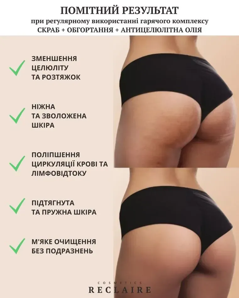 Гарячий антицелюлітний комплекс розігріває, підтягує та допомагає зменшити “апельсинову кірку” вже після перших процедур.