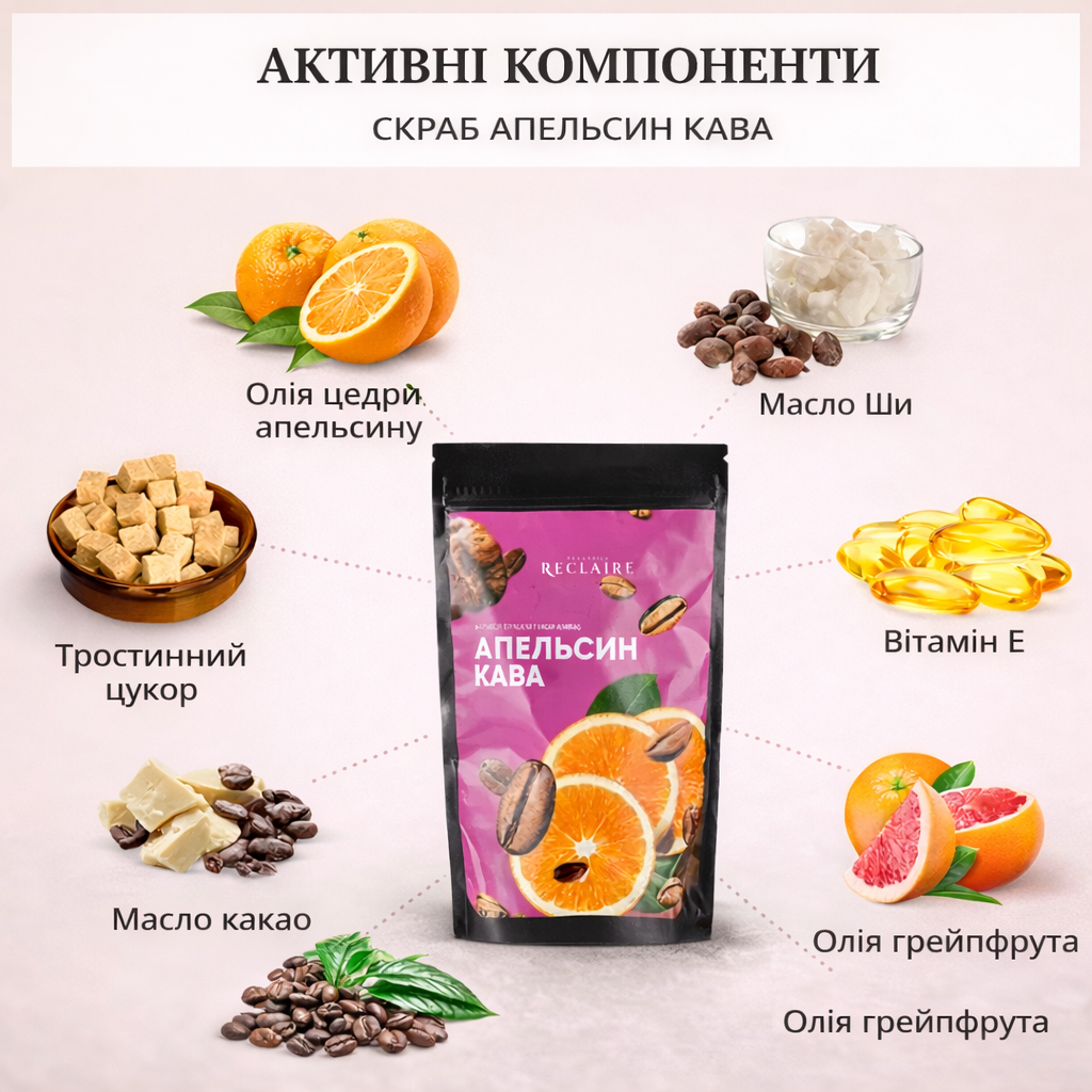 Скраб “Апельсин-Кава” створений для глибокого очищення шкіри та покращення її зовнішнього вигляду.